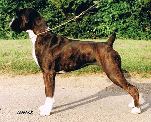 She went on to become one of my best producing bitches. When mated to CH SEACREST DANOLI AT CARMONDENE, she produced Seacrest Kayf Tara, the dam of Ch Sleipnir Olaf The Stout, and his litter sister Ch Sleipnir Viking Goddess.. From her second litter to Ch Jenroy Edge of Darkness, I kept a near solid brindle bitch Seacrest Manna D’Argent, who I subsequently mated to the exciting Jacinto D’Jandilla. This produced the most stunning puppy, Seacrest The Expatriate, who sadly hated the ring with a passion, thankfully I also kept a solid bitch to breed on with. Bea’s final litter was by Ch Designer Game At Glenauld, and I kept a male SEACREST PILSUDSKI. Bea retired to live out her days along with her mum Jodami and Hello Dolly Glenfall, in 10 acres in the south of France, when my close friends moved there.