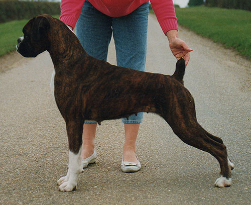 The first show of 1991 was CRUFTS, judged by Sheila Cartwright (Tyegarth), where Bobby won a star-studded open bitch class, and took her 4th CC. Following a further Reserve CC from Bruce Cattanach at Windsor, Bobby gained the CC at London & Home Counties Boxer Club, going one better under Denise Mastaglio than at Belfast, and was then retired for maternal duties with a total of 5 CC’s 7 Reserve CC’s.