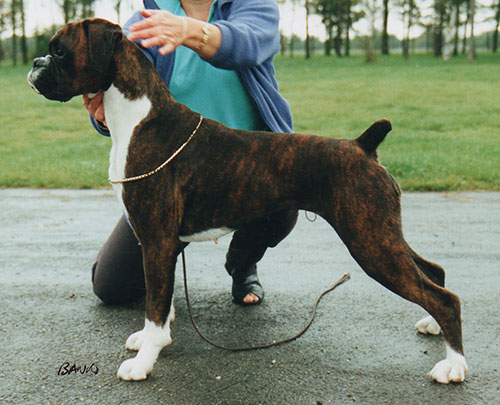 She was awarded her 1st CC and Best in Show, at Tyne Wear & Tees Boxer Club in May 1999 by Paul Russell, quickly followed by her 2nd CC a month later at Blackpool, under Anna Donnachie, where she and Danoli took both CC’s , making a Seacrest double. Her crowning CC swiftly followed in July 1999 from Jenny Livy at Paignton. Another double was completed, when she & Danoli again took both CC’s under Nadia Sasse, in September 1999 on the annual trip “across the water” to Northern Ireland. Two further CC’s were awarded in 2000 firstly when Pat Heath officiated at Birmingham National in April, then a 6th CC at Scottish KC in May under Carol Chippendale. Bronte also gained 6 Reserve CC’s before she was retired for maternal duties.