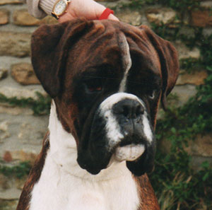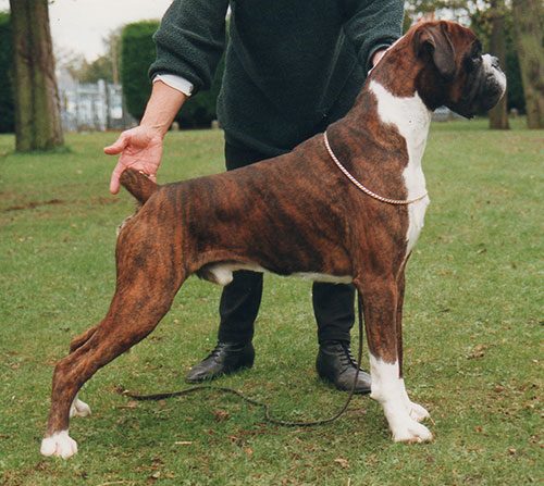 Ironically this turned out to be a beginning not an end, when his new owner asked me to handle him, due to ring nerves. He was shown in joint names, and I handled him to 9 CC’S, 7 with BEST OF BREED, and 5 RESERVE CC’s. He was also awarded TOP BOXER 1999 by the British Boxer Club, and was DOG OF THE YEAR 2000, at the COTSWOLD BOXER CLUB NATIONAL FINALS handled on that day by Lynn Mair, as I was at home whelping my bitch. He was awarded GROUP 2 at BLACKPOOL, and GROUP 3 at CRUFTS.