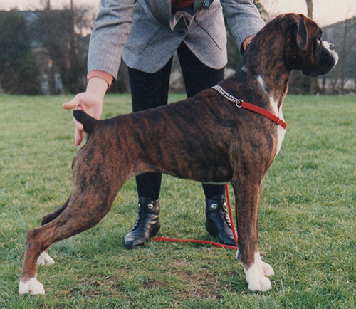 The highlight of her career came when she took the RESERVE CC behind the prolific CC winner CH Roamaro Scotch Mist of Winuwuk, under Angela Kennett, at the British Boxer Club in 1995. As she retained her youthful figure we brought her back out at 7 years in veteran classes, where she was hugely successful regularly beating the Champion bitches, including 1st Veteran bitch at CRUFTS 2001, and 2nd Veteran bitch CRUFTS 2000.