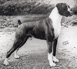 A permanent back injury, resulting from a bad fall, ended my life in racing and it was then that fate played its hand when I received a Boxer bitch as a belated wedding present from a friend of my mothers. Having competed all my life it seemed natural to show her and that as they say was that!